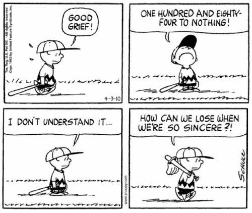 I did a Google search and found the cartoon. Dad was pretty close on the quote, as you can see, but Charlie Brown’s actual question hit me even more directly: “How can we lose when we are so