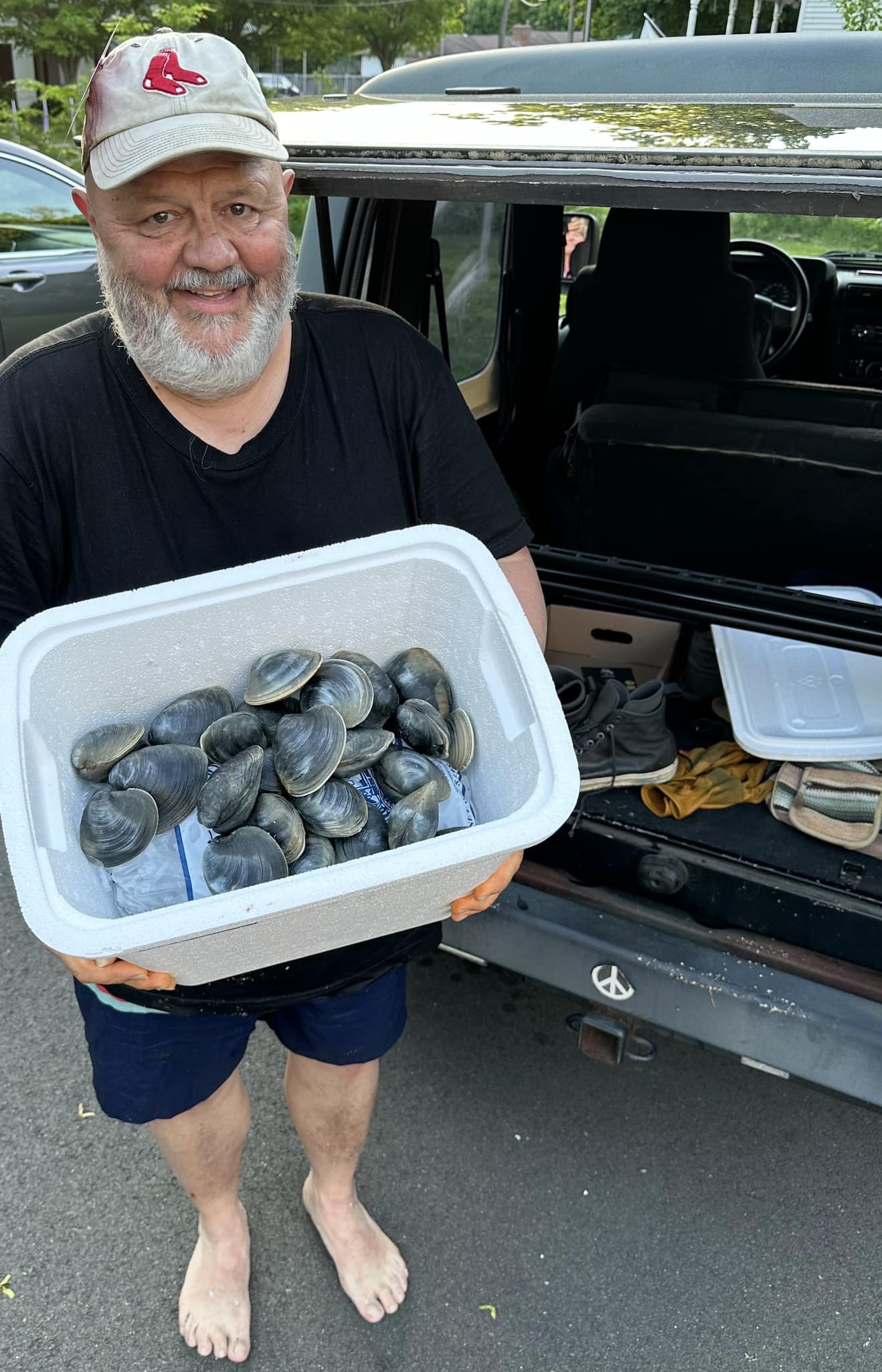 A man in the Guilford church named Charlie has talked to me about going for a while, but Friday around noon I got a text that was more specific inviting me to join him at low tide late that afternoon. I had to move quickly to get a license at the town hall and gather a few items he told me to bring, and then I drove out to the end of Trolley Road to begin my adventure.