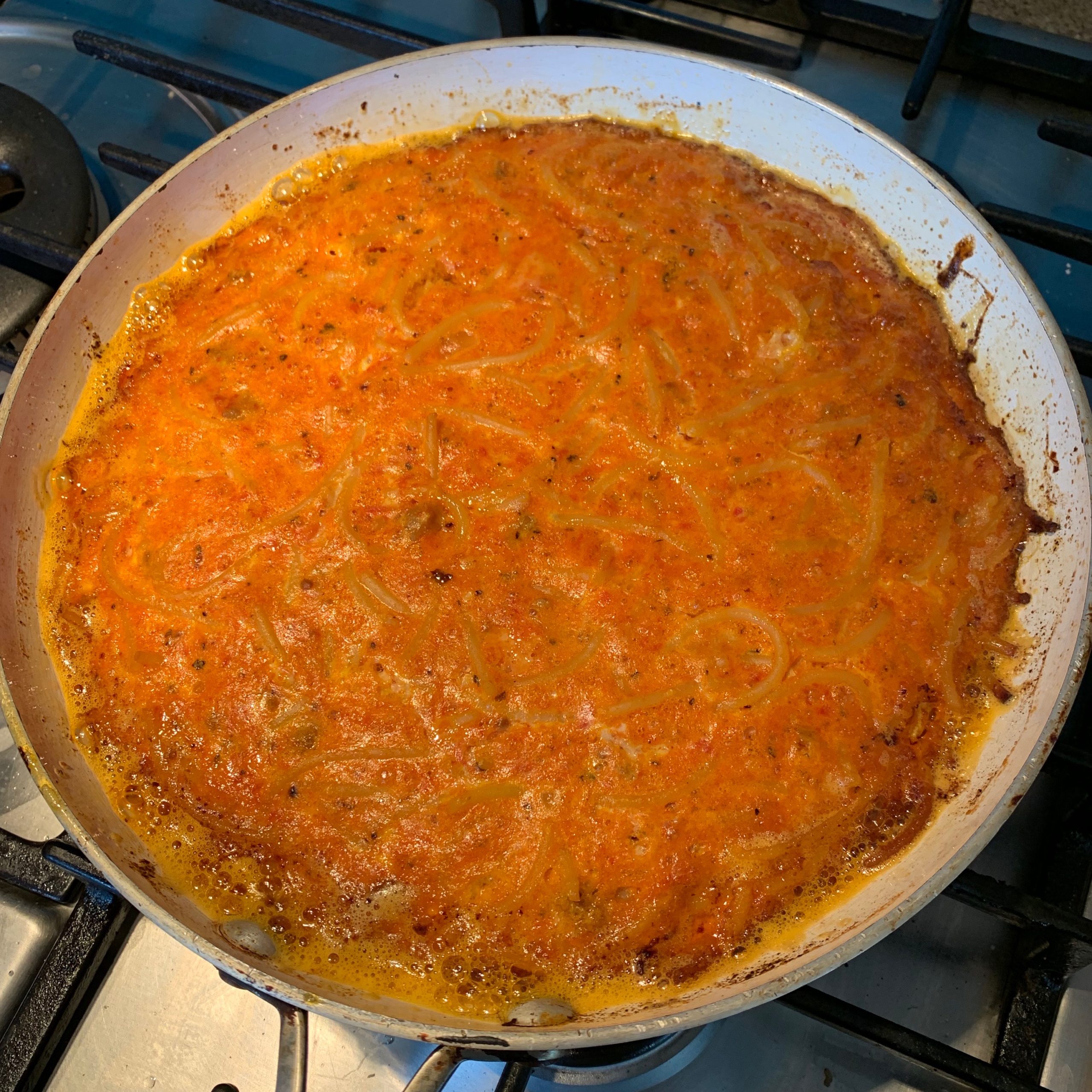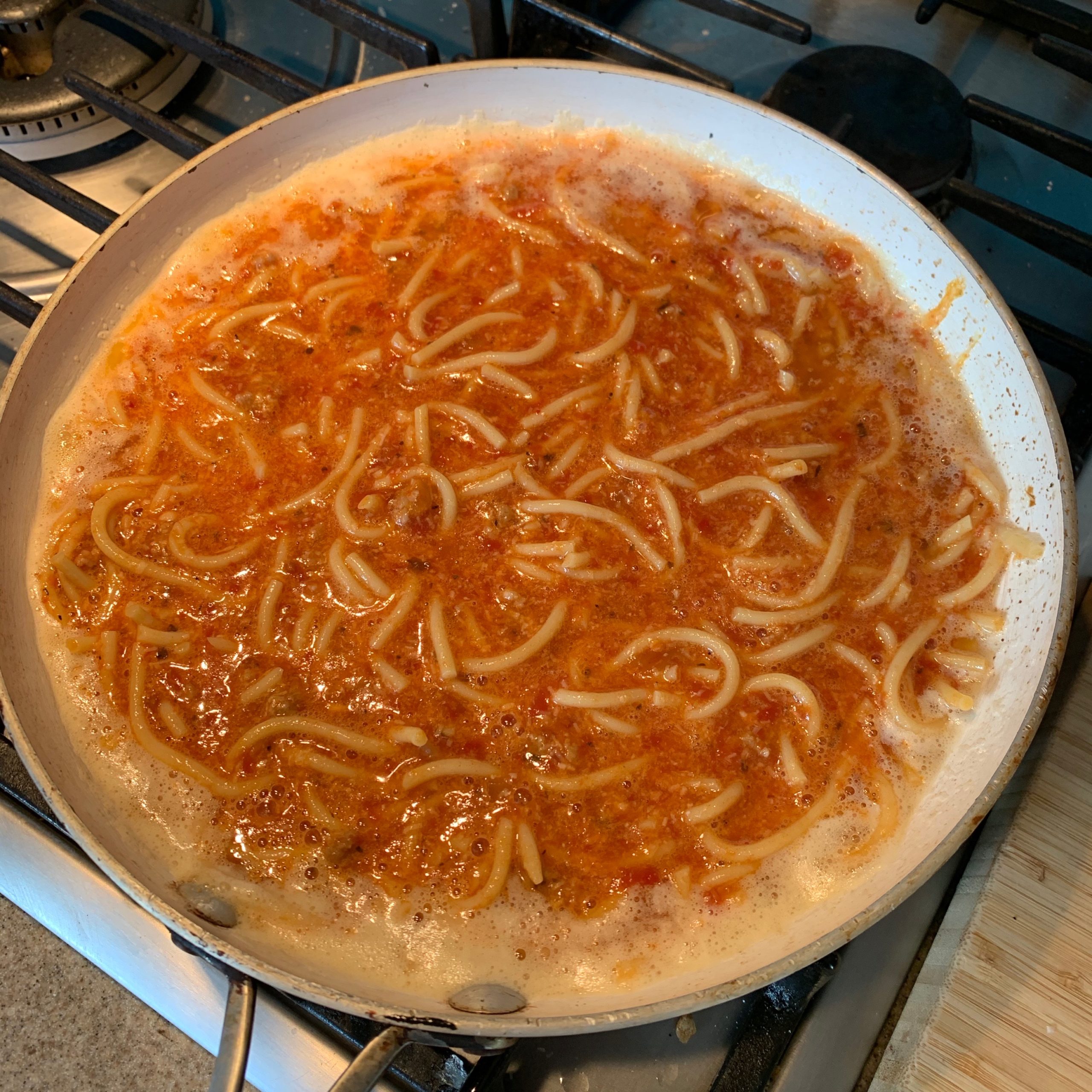 *NOTE: The recipe I found also gave instructions for cooking pasta to make a frittata. Cook 1/4 pound of linguine, fettuccine or other long pasta. Bring a large pot of water to a boil, and salt it. Cook pasta until barely tender, somewhat short of where you would normally cook it. Drain, and immediately toss it in a wide bowl with 2 tablespoons the butter or oil (which would bring the total for the recipe to 4). Cool it a bit. The recipe also gave instructions if you wanted to add bacon or pancetta that had not been cooked: If you are using meat, add it, and cook, stirring occasionally until crisp, 3 to 5 minutes.