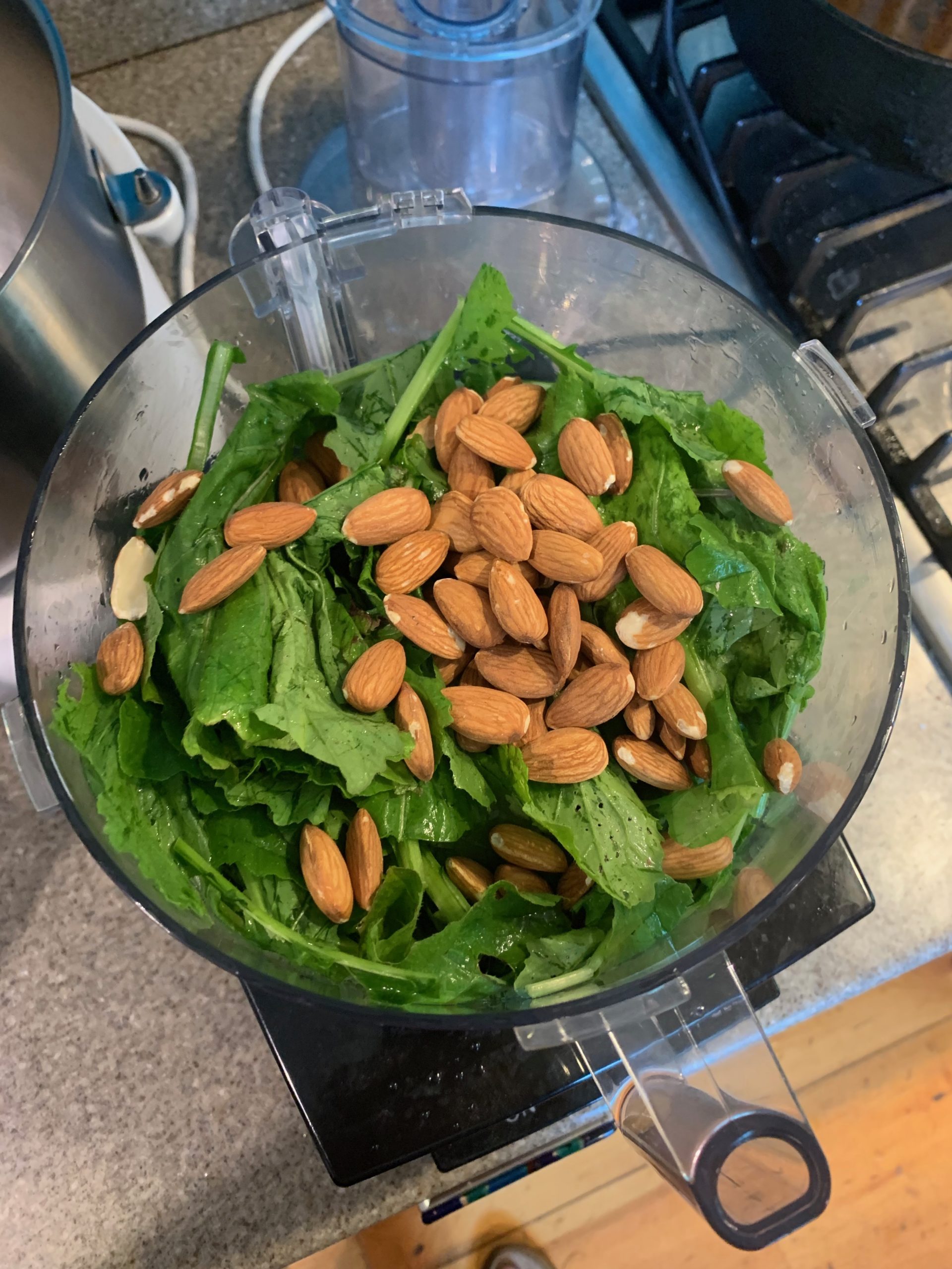 Put the almonds and the garlic in a food processor and pulse until they break up. I used three cloves of garlic because I like garlic. Was and rinsed the greens, tear them and add them to the food processor. Add about a fourth of the olive oil and pulse until the mixture begins to come together. Scrape down the sides. Turn on the food processor and drizzle in the rest of the oil. Add salt and lemon juice to taste. It won’t take much of either.