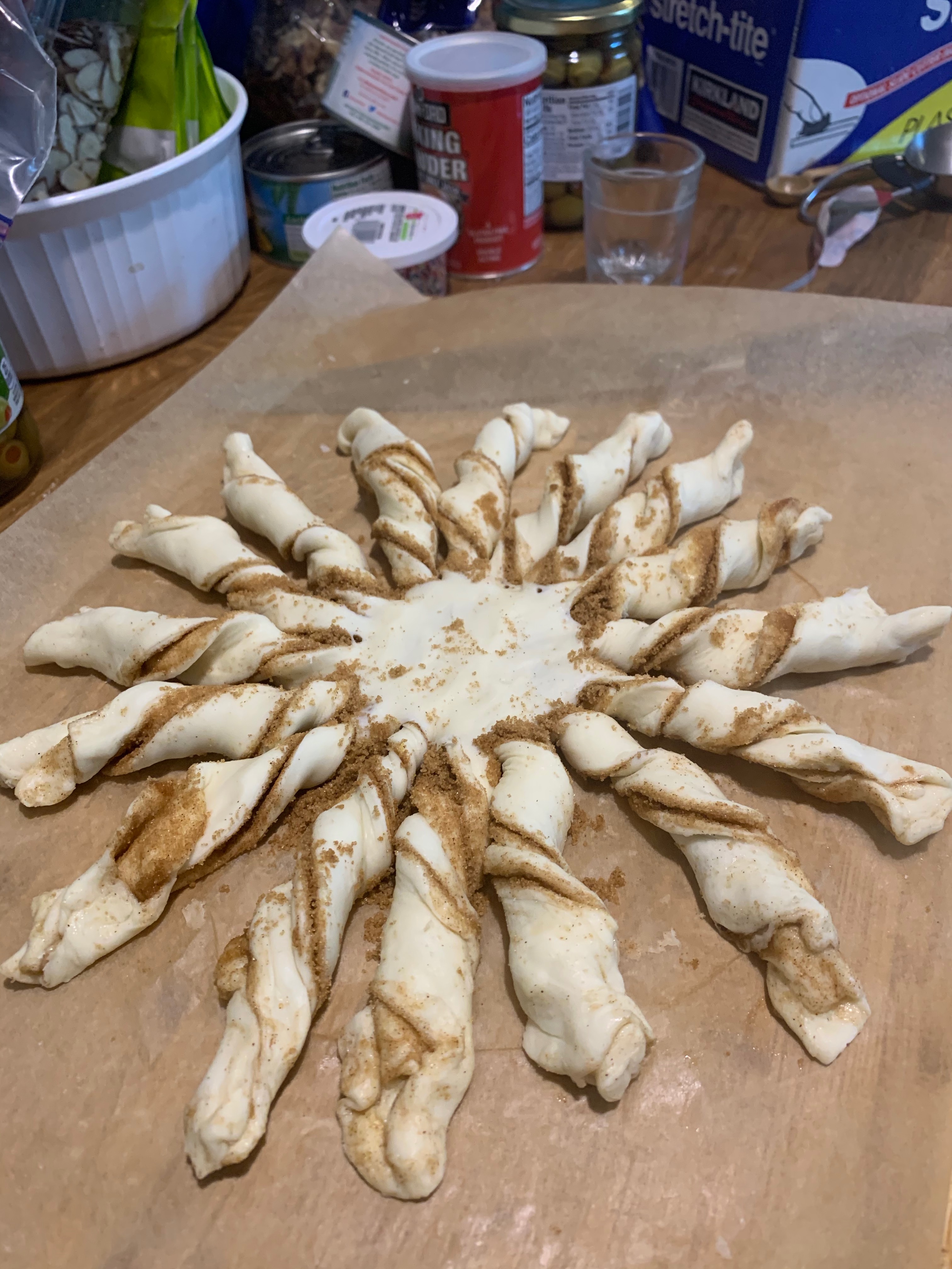 Remove the glass. Place a finger the ray meets the center ( and where it is most likely to break off prematurely) and gently twist each strand a few times. Beat the egg yolk with a teaspoon of water and brush it over the pastry; you can also sprinkle the top with some cinnamon sugar.