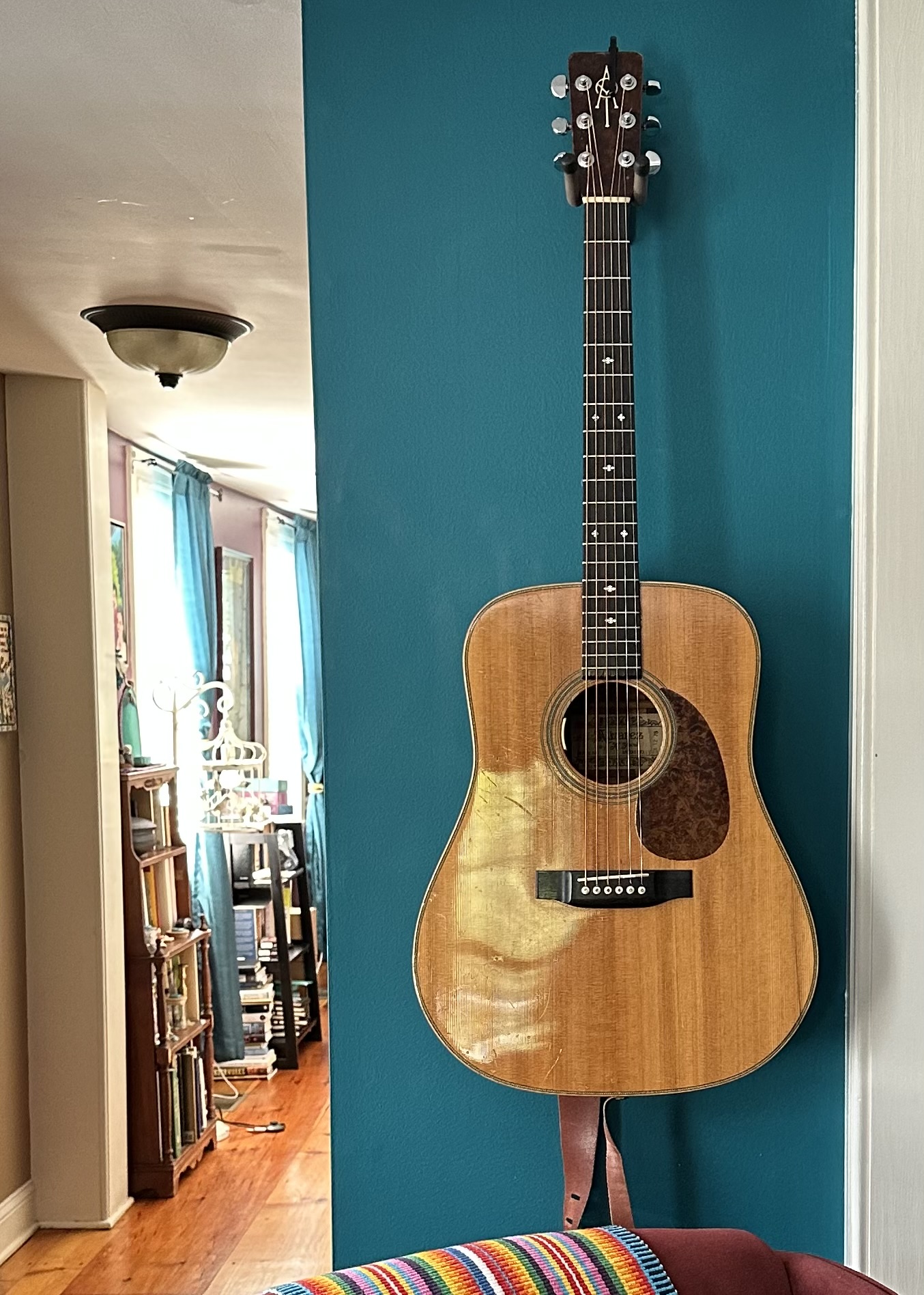 Since we moved to Guilford (seven and a half years ago), my guitar has never really found a place to hang out. It lives in its case most of the time, which then has to be tucked in behind the chair that Ginger uses when she works from home. As a result, I have played a good deal less over the past seven years--not by choice as much by convenience, I guess.