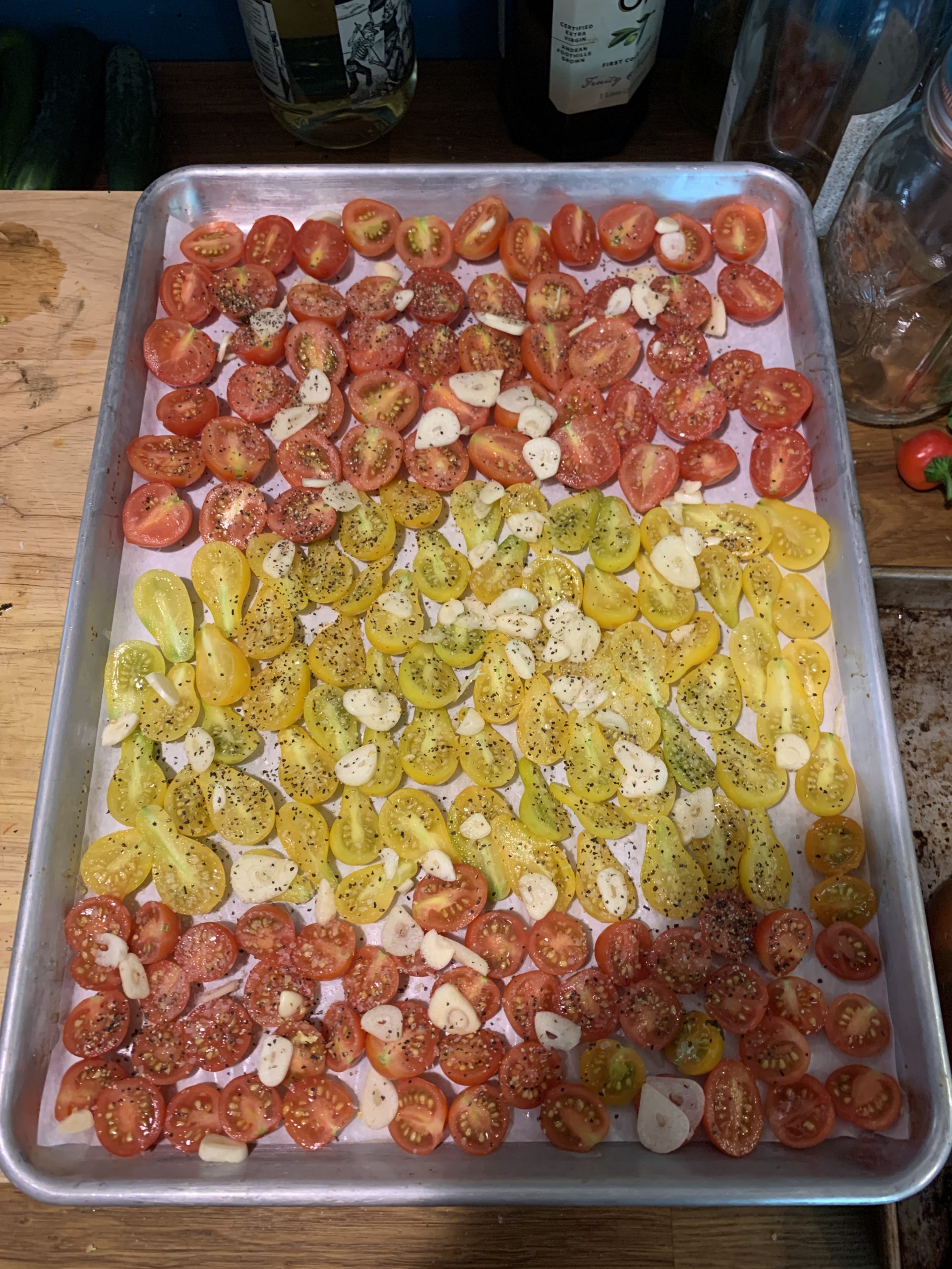 Line a baking sheet with parchment. Cut the tomatoes in half longwise (slice where then stem was) and arrange them on the baking sheet so they are close together. Get as many in there as you can. Drizzle with olive oil (you don’t want to drown these) and sprinkle with salt and pepper. If you want a little kick to them, add some crushed red pepper. Lay the herbs across the top. One again, you don’t need to pull them off of their stems.