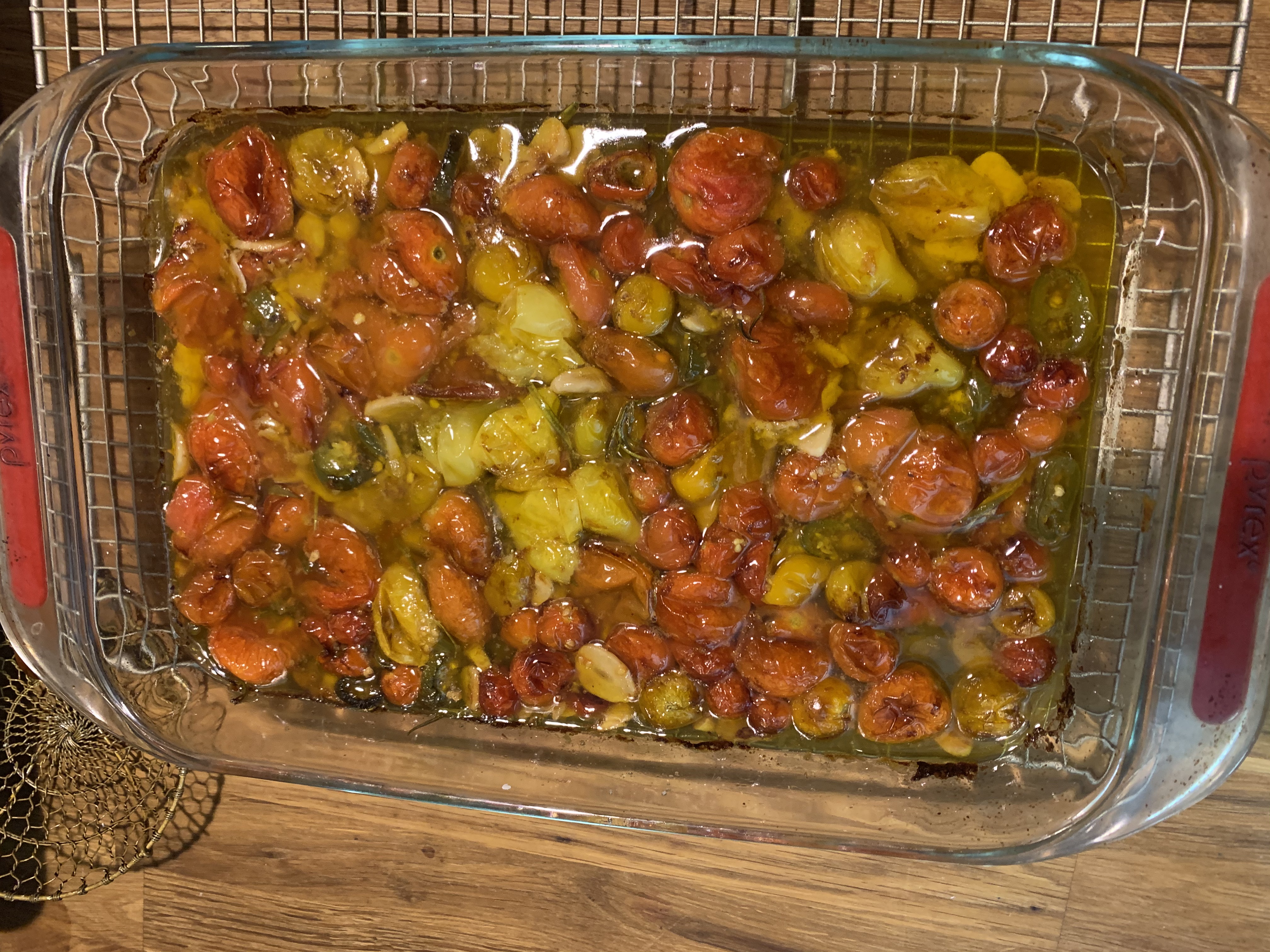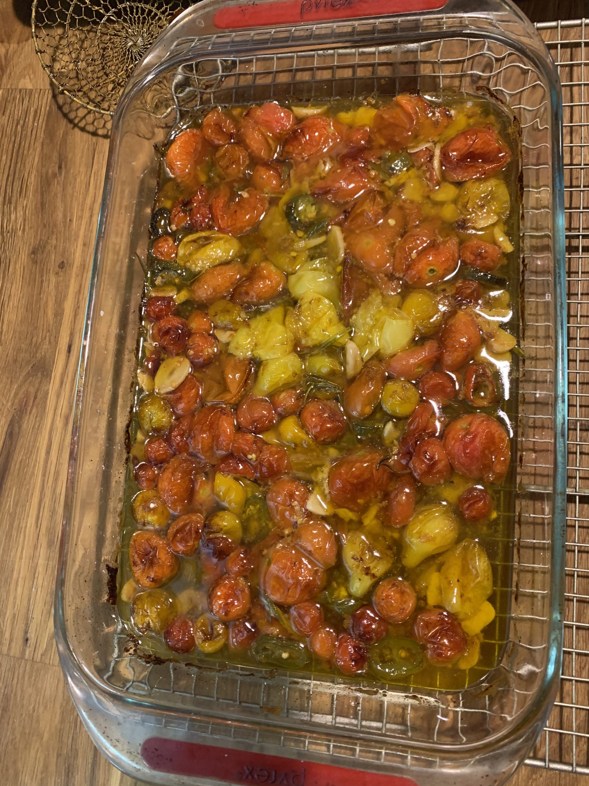 Roast for about 2 hours, until the tomatoes look wrinkled but are not bursting. Set the pan aside and let it cool. Squeeze the garlic out of its peel and put it back in the confit.