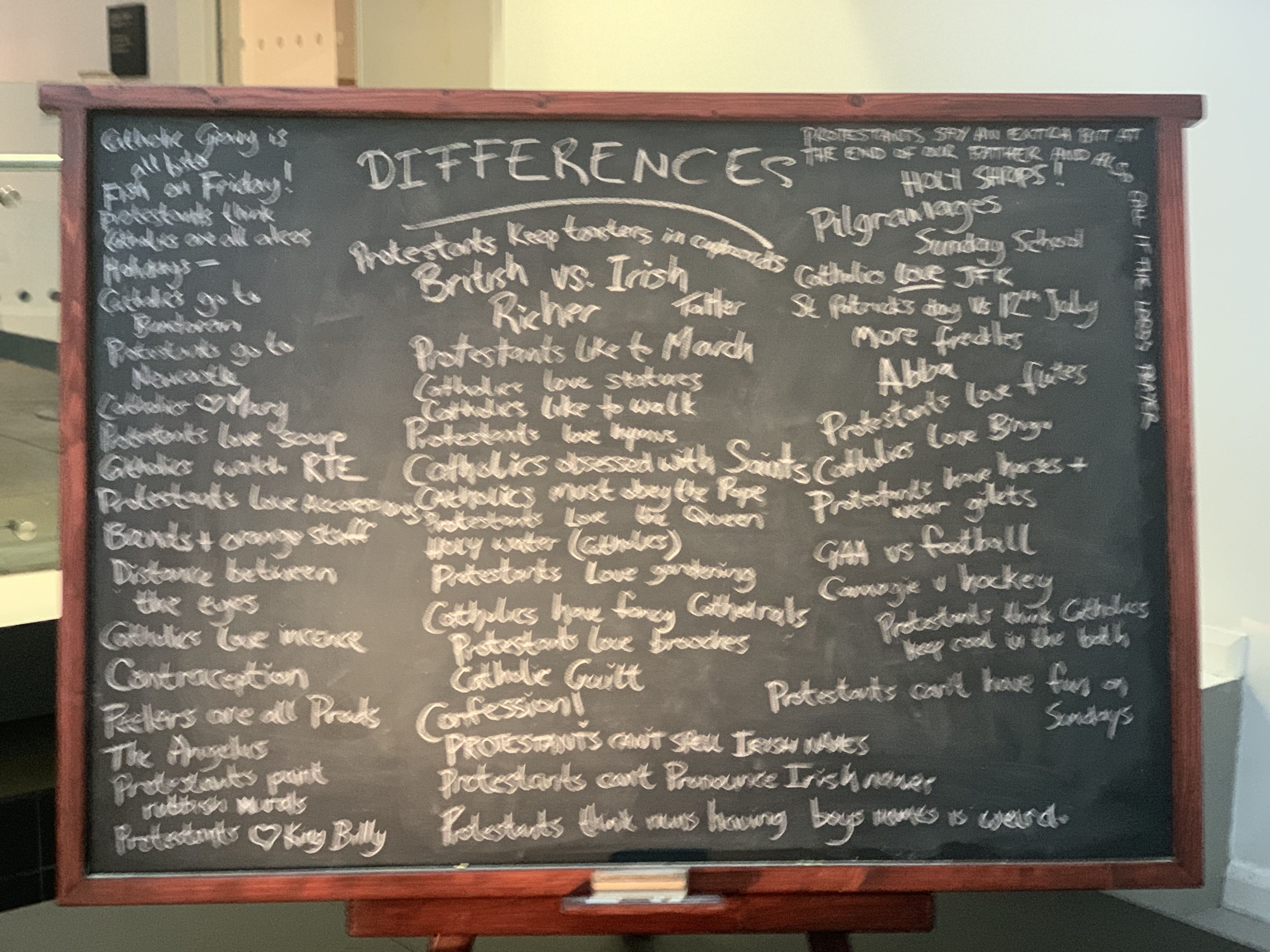 We visited the Ulster Museum later in the day and, thanks to the direction of a very helpful docent, were led into an exhibit that showed the seeds of the Troubles going all the way back to ships in the Spanish Armada that sank off the coast of Ireland centuries before there was a Belfast. Towards the end of the exhibit was a blackboard from an episode of